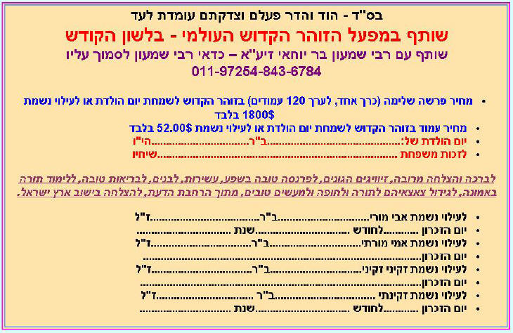 בס"ד - הוד והדר פעלם וצדקתם עומדת לעד שותף במפעל הזוהר הקדוש העולמי - בלשון הקודש שותף עם רבי שמעון בר יוחאי זיע"א – כדאי רבי שמעון לסמוך עליו 011-97254-843-6784