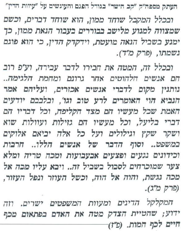 ב"ה הפלגת העונשים החמורים של החטא דעיוות הדין, כמתואר בדברי חז"ל: 1. כד דיין דן דינא דשקרא – שליט עלי' מלאך המות ושחיט לי' – ולבתר אוקיד לי' בגיהנם (זהר הקדוש, רעיא מהימנא משפטים, קי"ז, א'). 2. כתב הד"מ ברקנ"ט בתחילת פרשת משפטים (דיבור המתחיל "אשר תשים לפניהם") בשם מדרש רות, וזה לשונו: פתח ההוא סבא ואמר, ויהי בימי שפוט השופטים (רות א', א'), בזמן שהקדוש ברוך הוא דן את העולם, למי דן תחלה? לאותם שהם דנין את העולם, ומי דן להם הקדוש ברוך הוא – מפני קלקול הדין! 3. אמר ר' יודן, מאי דכתיב (משלי י"ג כ"ג), רב אמר ניר ראשים ויש נספה בלא משפט..., יש מי שעומד בשלוה ונספה מן העולם, על איזה עון? על עון שמקלקל את הדין ומעוותין אותו! (הב"י בבדק הבית, חו"מ א'). 4. כל דיין שמטה את הדין, גורם שממון לעולם, שנאמר (שמעו נא זאת ראשי בית יעקב וקציני בית ישראל, המתעבים משפט ואת כל הישרה יעקשו, ועל ה' ישענו לאמר הלא ה' בקרבינו לא תבא עלינו רעה, לכן מביא עליהם שלש פרעניות (אוצה"מ קל"ח, ח'). 5. כל דיין שנוטל מזה ונותן לזה שלא כדין, הקדוש ברוך הוא נוטל ממנו [נפשות] את נפשו (שם, שם). 6. אם ראית דור שצרות רבות באות עליו, "צא ובדוק" בדייני ישראל, שכל פרעניות שבא לעולם, לא בא אלא בשביל דייני ישראל! (המטין את הדין, רש"י), (שבת קל"ט, א'). 7. אין בן דוד בא עד שיכלו שופטים רעים מישראל (שם, וסנהדרין צ"ח, א'). 8. לא גלתה יהודה אלא על שלא העמידו את הדין, שנאמר (איכה א', ה') היו שרי' כאילים לא מצאו מרעה, מה איל זה, ראשו של זה בצד זנבו של זה, כך דייני ישראל שבאותו דור [שהדיינים שבזמנינו הם גלגולים מהם, וכדלקמן, זה כובש פניו מפני זה, וזה כובש פניו מפני זה [כלומר שמשתפין פעולה לעיוות הדין (לנהל מהלך המשפטים לפי טובת ה"ביזנעס" – נגד הלכות מפורשות שבהלכות דיינים שבשולחן-ערוך), ומעלימים עיניהם איש מרשעת רעהו], כך אמר להם הנביא: שריך סוררים וחברי גנבים רודפי שלמונים (ישעי' א', כ"ג), מהו רודפי שלמונים? שהיו אומרים זה לזה: עשה עמי [טובה] היום [שבעל דין פלוני ינצח] ואני אשלם לך למחר! והנביא צווח ואומר: מלאתי משפט צדק ילין בה ועתה מרצחים! חכיתי להם שיעמידו את השופטים ויקיימו את הדין, הן לא כן עשו, אלא עשו את [ה"ביזנעס אינטערעססן"] שלהן עיקר – ואת הדין טפילה, שנאמר (ישעיהו ה', ו') ויקו למשפט – והנה משפח! לצדקה – והנה צעקה! ולפיכך ה' במשפט יבא אם זקני עמו (אוצה"מ קל"ח, ח'). שני עונשים מבהילים על דיינים שמדקדקין דקדוקין לזכות את הרשע – אפילו על פי הדין (וכל שכן בעיוות הדין] 1. כתב הר"ם מרקנ"ט ראש פרשת משפטים (דיבור המתחיל "אשר תשים") בשם מדרש רות הנעלם: אמר ר' יודן כל דיין שלא "מחמיר" את הדין אין מחמיצין את דינו למעלה ומסתלק מן העולם קודם זמנו, הדא הוא דכתיב (משלי י"ג, כ"ג) ויש נספה בלא משפט. יש מי שדן דין אמת לאמיתו... ונתפסו כגון דיין שדן ומדקדק דקדוקין לזכות לרשע...!, והדיין מסתלק עצמו מלהענישו, ומדקדקין בענין הדין למצוא פתח לזכות אותו מן הדין ממש, כשהקדוש ברוך הוא דן את העולם אותו דיין נתפס עליו ונסתלק עליו קודם זמנו, ואם לאו [רוצה לומר, כשאינו מסתלק מן העולם, אז יתן לו הקדוש ברוך הוא העונש דלקמן (חידושי הגהות, שם אות י')], עליו נאמר (איוב י"ח, י"ט): לא נין לו ולא נכד בעמו, כשעצמו אינו נתפס [נתפס זרעו]... דלא תימא דיינא אפיק לי' בדין תורה וסגי לי', אלא דיינא דלא עביד סייג לתורה – אין לו סייג לא בעולם הזה ולא לעולם הבא סייג, שלא נין ונכד, עצור ועזוב הוא בעולם הזה, ובעולם הבא מעבירים ממנו אותם מעשים טובים שהם סייג לעולם הבא לאדם (הב"י בבדק הבית, חו"מ סימן ב'). 2. נודע, דעיקר ביאת האדם לעולם הזה, הוא כדי לתקן מה שפגם בגלגולים הקודמים, ואם רוצה האדם לדעת איזה פגם שבא לתקן, כבר נתנו בספר הקדוש "שבט מוסר" (א', י"ג) סימן לזה: דלאותה עבירה שנמשך אלי' – ורודף אבתרי' להכשילו – ויש לו נסיון גדול וקשה לפרוש ממנה, ידע בבירור שבשביל זה הוא עיקר ביאתו לעולם לתקן עניינה (אור המאיר, נשא). 3. עכשיו – טרם ביאת המשיח, הוא ההזדמנות האחרונה להנך דיינים שבימינו שיתקנו את 