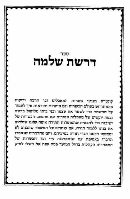 בו יבואר כי שמירת הגוף והנפש ממאכלות אסורות הוא יסוד קדושת ישראל וטהרתן, גם יבואו בו דברי התעוררות לבאר גודל הפגם המגיע לנפש וגוף האדם הנכשל בהם ח"ו, והתועלת בזה ובבא למי שנזהר ונשמר ממאכלות אסורות
