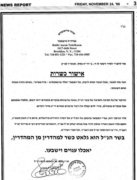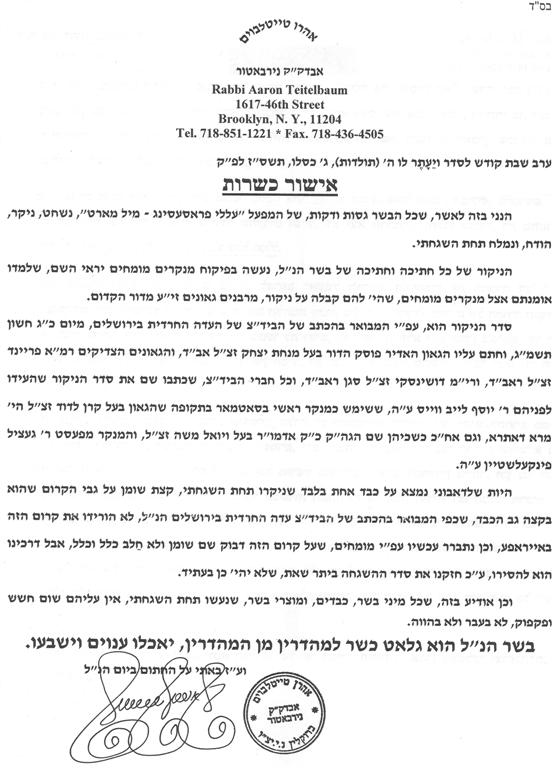 דברי תוכחה אלו מיועד לכל ארגוני וועד הכשרות למיניהם, רבני ושליחי חב"ד בכל העולם כולו, כל הרבנים משגיחים, ועוד.UNITED STATES and CANADA California Igud Hakashrus of Los Angeles (Kehillah Kosher) Rabbi Avraham Teichman (323) 935-8383 186 North Citrus Ave., Los Angeles, CA 90036 Vaad Hakashrus of Northern California 510-843-8223 2520 Warring St. Berkeley, CA 94704 Rabbinical Council of California (RCC) Rabbi Nissim Davidi (213) 489-8080 617 South Olive St. #515, Los Angeles, CA 90014 Colorado Scroll K Vaad Hakashrus of Denver Rabbi Moshe Heisler (303) 595-9349 1350 Vrain St. Denver, CO 80204 District of Columbia Vaad HaRabanim of Greater Washington Rabbi Binyamin Sanders 518-489-1530 7826 Eastern Ave. NW, Suite LL8 Washington DC 20012 Florida Kosher Miami Vaad HaKashrus of Miami-Dade Rabbi Mordechai Fried Rabbi Manish Spitz (786) 390-6620 PO Box 403225 Miami, FL 33140 Florida K and Florida Kashrus Services Rabbi Sholom B. Dubov (407) 644-2500 642 Green Meadow Ave. Maitland, FL 32751 South Palm Beach Vaad (ORB) Rabbi Pesach Weitz (305) 206-1524 5840 Sterling Rd. #256 Hollywood, FL 33021 Georgia Atlanta Kashrus Commission Rabbi Reuven Stein (404) 634-4063 1855 La Vista Rd. Atlanta, GA 30329 Illinois Chicago Rabbinical Council (cRc) Rabbi Sholem Fishbane www.crcweb.org (773) 465-3900 2701 W. Howard, Chicago, IL 60645 Midwest Kosher Rabbi Yehoshua H. Eichenstein Rabbi Chaim Tzvi Goldzweig 773-761-4878 Indiana Indianapolis Beth Din Rabbi Avraham Grossbaum Rabbi Shlomo Crandall (317) 251-5573 1037 Golf Lane Indianapolis, IN 46260 Iowa Iowa “Chai-K” Kosher Supervision Rabbi Yossi Jacobson (515) 277-1718 943 Cummins Pkwy Des Moines, IA 50312 A Service of the Kashrus Division of the Chicago Rabbinical Council - Serving the World Back to Top Kentucky Louisville Vaad Hakashrut 502-459-1770 PO Box 5362 Louisville, KY 40205 Louisiana Louisiana Kashrut Committee Rabbi Nemes 504-957-4986 PO Box 55606 Metairie, LA 70055 Maryland Star-K Kosher Certification (chalav Yisrael) Dr. Avram Pollack (410) 484-4110 122 Slade Ave. #300 Baltimore, MD 21208 Star-D Certification (non-chalav Yisrael) Dr. Avram Pollack (410) 484-4110 122 Slade Ave. #300 Baltimore, MD 21208 Massachusetts New England Kashrus LeMehadrin 617-789-4343 75 Wallingford, MA 02135 Vaad Hakashrus of Worcester 508-799-2659 822 Pleasant St. Worcester, MA 01602 Rabbi Dovid Moskovitz (617) 734-5359 46 Embassy Road Brighton, MA 02135 Michigan Council of Orthodox Rabbis of Greater Detroit (Merkaz) Rabbi Yosef Dov Krupnik (248) 559-5005 16947 West Ten Mile Rd. Southfield, MI 48075 Minnesota United Mehadrin Kosher (UMK) Note: unless the meat states that it is glatt, it is certified not-glatt by the UMK. The cRc only accepts Glatt Kosher meats. Rabbi Asher Zeilingold (651) 690-2137 1001 Prior Ave. South St. Paul, MN 55116 Missouri Vaad Hoeir of Saint Louis (314) 569-2770 4 Millstone Campus St. Louis, MO 63146 New Jersey Badatz Mehadrin -USA 732-363-7979 1140 Forest Ave. Lakewood, NJ 08701 Double U Kashrus Badatz Mehadrin USA Rabbi Y. Shain (732) 363-7979 1140 Forest Ave. Lakewood, NJ 08701 Rabbi Shlomo Gissinger (732) 364-8723 170 Sunset Rd. Lakewood, NJ 08701 Kashrus Council of Lakewood N.J. Rabbi Avrohom Weisner (732) 901-1888 750 Forest Ave. #66 Lakewood, NJ 08701 Kof-K Kosher Supervision Rabbi Zecharia Senter (201) 837-0500 201 The Plaza Teaneck, NJ 07666 Rabbinical Council of Bergen County 201-287-9292 PO Box 1233 Teaneck, NJ 07666 New York-Bronx Rabbi Zevulun Charlop (718) 365-6810 100 E. Mosholu Parkway South Bronx, NY 10458 New York-Brooklyn Rabbi Yechiel Babad (Tartikover Rav) (718) 951-0952/3 5207-19th Ave. Brooklyn, NY 11204 Central Rabbinical Congress (Hisachdus HaRabanim) Rabbi Yitzchak Glick (718) 384-6765 85 Division Ave. Brooklyn, NY 11211 Rabbi Yisroel Gornish 718-376-3755 1421 Avenue O Brooklyn, NY 11230 Rabbi Nussen Naftoli Horowitz Rabbi Benzion Halberstam (718) 234-9514 1712-57th St. Brooklyn, NY 11204 Kehilah Kashrus (Flatbush Community Kashrus Organization) Rabbi Zechariah Adler (718) 951-0481 1294 E. 8th St. Brooklyn, NY 11230 The Organized Kashrus Laboratories (OK) Rabbi Don Yoel Levy (718) 756-7500 391 Troy Ave. Brooklyn, NY 11213 Rabbi Avraham Kleinman Margaretten Rav 718-851-0848 1324 54th St. Brooklyn, NY 11219 Debraciner Rav Rabbi Shlomo Stern (718) 853–9623 1641 56th St. Brooklyn, NY 11204 Rabbi Aaron Teitelbaum (Nirbater Rav) (718) 851-1221 1617 46th St., Brooklyn, NY 11204 Rabbi Nuchem Efraim Teitelbaum (Volver Rav) (718) 436-4685 58085-11th Ave. Brooklyn, NY 11225 Bais Din of Crown Heights Vaad HaKashrus Rabbi Yossi Brook (718) 604-2500 512 Montgomery Street Brooklyn, NY 11225 Vaad Hakashrus Mishmeres L'Mishmeres 718-680-0642 1157 42nd. St. Brooklyn, NY 11219 Kehal Machzikei Hadas of Belz 718-854-3711 4303 15th Ave. Brooklyn, NY 11219 Vaad Harabanim of Flatbush Rabbi Meir Goldberg (718) 951-8585 1575 Coney Island Ave. Brooklyn, NY 11230 New York-Manhattan K’hal Adas Jeshurun (Breuer’s) Rabbi Moshe Zvi Edelstein (212) 923-3582 85-93 Bennett Ave, New York, NY 10033 Orthodox Jewish Congregations (OU) Rabbi Menachem Genack (212) 613-8241 11 Broadway New York, NY 10004 New York-Queens Vaad HaRabonim of Queens (718) 454-3529 185-08 Union Turnpike, Suite 109 Fresh Meadows, NY 11366 New York-Long Island Vaad Harabanim of the Five Towns and Far Rockaway Rabbi Yosef Eisen (516) 569-4536 597A Willow Ave. Cedarhurst, NY 11516 New York-Upstate Vaad HaKashrus of Buffalo Rabbi Moshe Taub (716) 634-3990 3940 Harlem Rd. Amherst, NY 14226 The Association for Reliable Kashrus Rabbi Shlomo Ullman (516) 239-5306 104 Cumberland Place Lawrence, NY 11559 Rabbi Mordechai Ungar 845-354-6632 18 N. Roosevelt Ave. New Square, NY 10977 Bais Ben Zion Kosher Certification Rabbi Zushe Blech (845) 364-5376 30 Mariner Way Monsey, NY 10952 Vaad Hakashrus of Mechon L’Hoyroa Rabbi Y. Tauber (845) 425-9565 ext. 101 168 Maple Ave. Monsey, NY 10952 Rabbi Avraham Zvi G