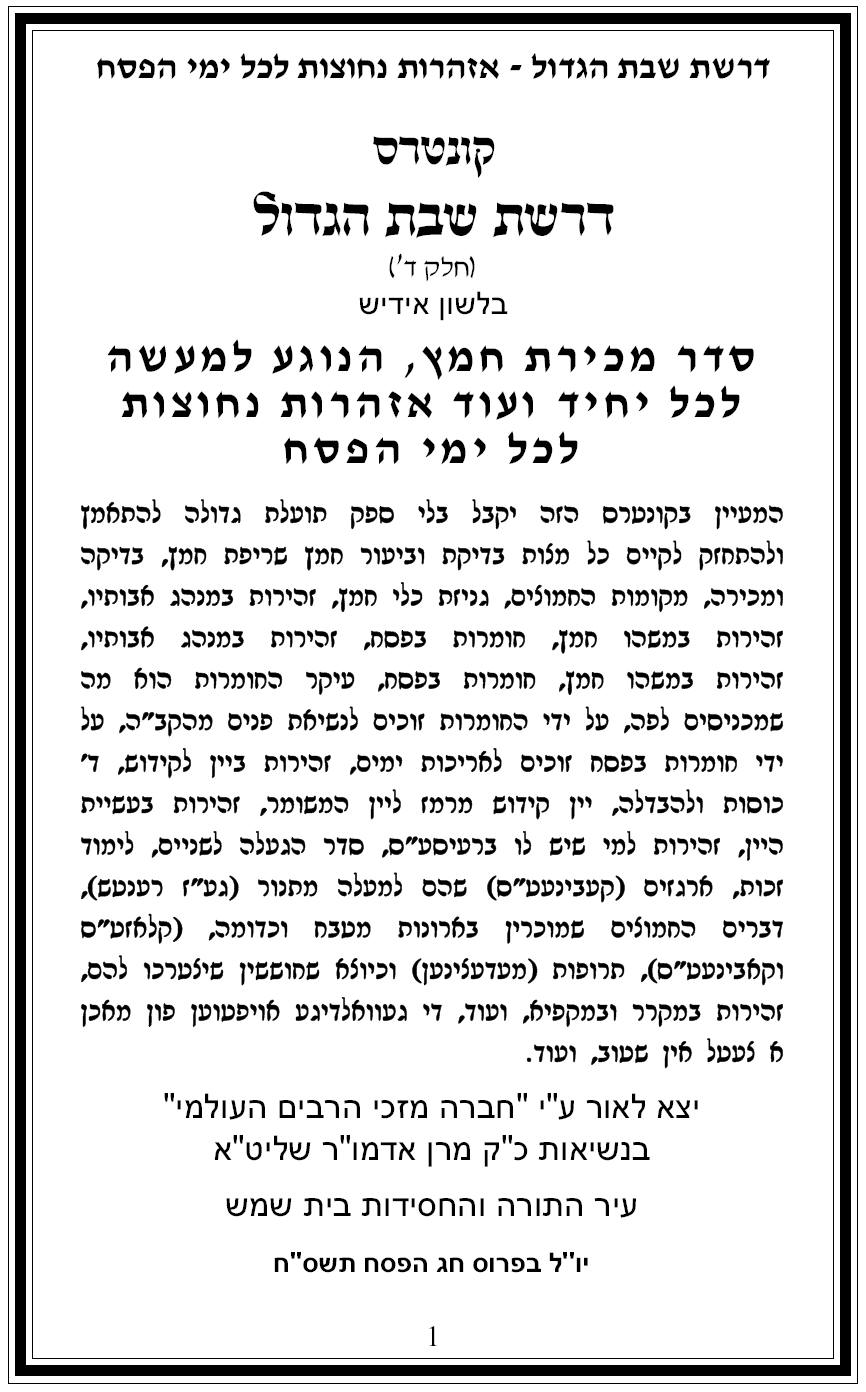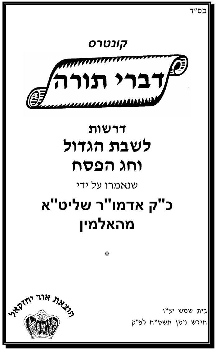 דרשת שבת הגדול מאת כ"ק אדמו"ר מהאלמין שליט"א - חלק א'