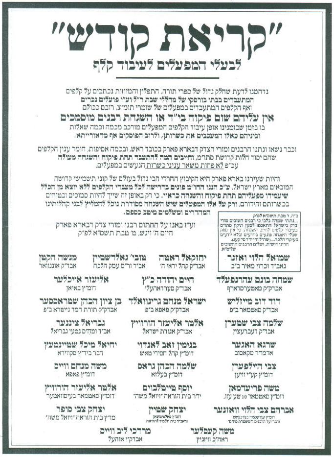 קודש" "קריאת קודש" לבעלי המפעלים לעיבוד קלף נדהמנו לדעת שחלק גדול של ספרי תורה, התפלין והמזוזות נכתבים על קלפים המתעבדים בבתי בורסקי של מחללי שבת ר"ל וע"י פועלים נכרים ואף הקלפים המתעבדים במפעילים של שומרי תומ"צ, רובים ככולם אין עליהם שום פיקוח בי"ד או השגחת רבנים מוסמכים בו בזמן שבזמנינו אופן עיבוד הקלפים המפעלים מורכז מכמה וכמה שאלות וביניהם כאלו המעכבים את כשרותן, ולרוב הפוסקים אף מדאורייתא. וכבר נשאו ונתנו הרבנים ומורי הצדק דבארא פארק בכובש ראש, ובכמה אסיפות, חומר ענין הקלפים ש הם יסוד חלות קדושת סתו"מ, וחייבים המה להתעבד תחת פיקוח והשגחה מעולה עכ"פ לא פחות משאר ענינ כשרות הנעשים במפעלים. והיות שעירנו בארא פארק היא הקיבוץ החרדי הכי גדול בעולם של קוני תשמישי קדושה המובאים מארץ ישראל, ע"כ הננו החו"מ פונים בדרישה לכל מעבדי הקלפים ללא יוצא מן הכלל שיעמידו מפעליהם תחת פיקוח והשגחה כראוי. כי רק באופן זה שייך להיות סמוכים ובטוחים בכשרותם והידורם, ורק על אלו המפעלים שיש השגחה מסוגרת נוכל להמליץ לבני קהלותינו המהדרים ומשלמים מיטב כספם. וע"ז באנו על החתום רבני ומורי צדק דבארא פארק היום ה' ויגש, ט' טבת תשס"א לפ"ק
